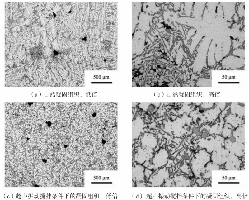圖5 A380合金在壓室中自然凝固組織以及在超聲振動攪拌條件下的凝固組織 二組元合金凝固時的二次枝晶臂間距(d2)和局部凝固時間(tc)的定性公式由Flemings等人推導而出。Han等人將二組元模型推廣為多組元模型如下: