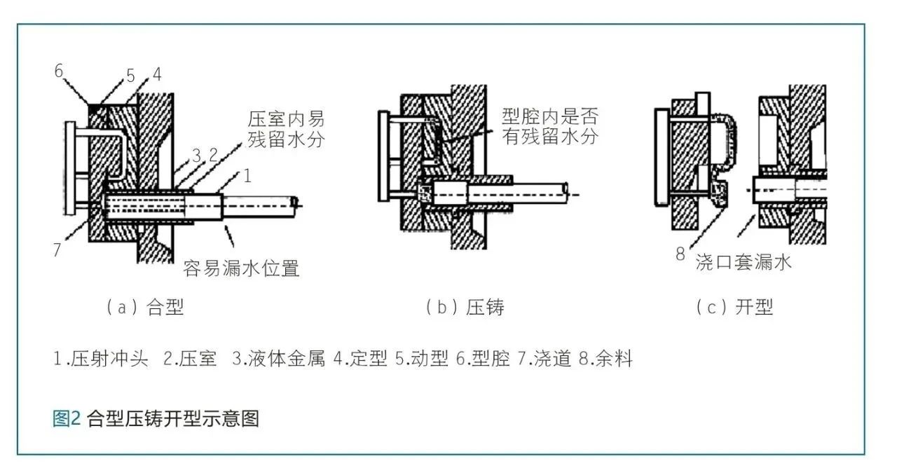 (3)原材料質量 合金是由多種金屬元素組成的混合物,其成分的穩定性直接決定壓鑄件的力學性能,如果合金成分不穩定,即各種金屬元素的含量無法保持在設計要求的范圍內,那么壓鑄件強度和耐用性將無法得到保證。例如,某種合金原材料應含有一定比例的銅和鋅元素,才能滿足特定的強度要求,但如果這兩種元素的含量無法穩定控制,會影響到壓鑄件的強度,甚至可能無法達到設計要求。在原材料生產過程中,難免會存在各種雜質,如氧化物、硫化物和金屬碎屑等,如果這些雜質的含量過高,它們將會在壓鑄過程中造成問題。一方面,高含量的氧化物和硫化物會降低合金的流動性,導致壓鑄件中出現氣孔,會降低壓鑄件的強度和密封性能;另一方面,金屬碎屑等夾雜物會使壓鑄件的組織不均勻,從而降低其整體性能。 應對思路研究 (1)控制生產環境 在壓鑄生產中,外部因素對生產環境的影響是不可忽視的,為了確保生產過程的穩定性和產品質量,需要采取相應的措施來應對這些外部因素。保持恒定的溫度和濕度是非常重要的。在壓鑄生產過程中,熔融金屬的流動性受到溫度的影響,如果溫度波動較大,將會直接影響熔融金屬的流動性能,從而影響產品的成型質量。 因此,在壓鑄車間內應保持一個恒定的溫度,通過安裝空調系統或者加強絕熱措施,避免溫度的劇烈波動。濕度也是需要控制的一個關鍵因素,高濕度會導致模具和壓鑄件表面出現水膜,影響產品的表面質量。為了降低濕度對模具和壓鑄件表面的負面影響,需要加強通風設備??梢园惭b排風扇或者通風管道,及時排除車間內的濕氣,保持空氣流通。同時,也可考慮在車間內增設除濕設備,將濕度降至合適的范圍。 (2)優化模具設計和制造 在壓鑄生產過程中,外部因素對于產品質量的影響不可忽視。為了有效應對這些因素,優化模具設計和制造是一種重要的思路。模具設計直接關系到產品質量和生產效率,工作人員要采用先進的模具設計軟件,準確分析模具的應力分布和變形情況,從而優化模具結構,使其更加合理和均衡,避免因模具結構不合理導致的產品缺陷和模具損壞。 同時,要提高對模具材料選擇的重視程度,盡可能選擇優質鋼材,有效提高模具的硬度和耐磨性,延長模具的使用壽命,并且能更好地保持產品的尺寸穩定性,加強產品表面質量。 除了以上兩個方面,還有其他應對思路值得考慮,如結合壓鑄工藝要求,優化模具的冷卻系統,以提高產品的冷卻速度和均勻性,減少產品缺陷。并通過合理設置模具的噴水孔和逃氣孔,有效避免熱疲勞和氣孔問題(見圖2)。