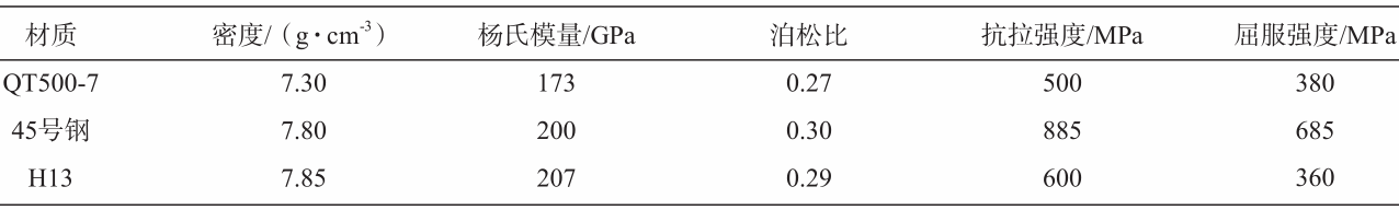 式中:{u}為結構上各離散點的位移向量;{R}為結構中所受外力的向量;{D}為材料的彈性矩陣;{B}為單元的幾何矩陣。 2.3 壓射保壓狀態仿真 將在SIEMENS NX 1899軟件中建立的三維模型分模塊進行文件導出,包括:①壓射室部分的裝配體;②液壓缸部分的裝配體;③增壓缸部分的裝配體。采用ANSYS Workbench中的靜態結構模塊進行仿真模擬。操作步驟大致分為以下內容。 (1)導入三維模型文件,進行結構材料選擇。沖頭、液壓缸活塞以及增壓缸活塞選擇材料為球墨鑄鐵QT500-7;壓射室、液壓缸以及增壓缸選擇材料為H13熱作模具鋼;液壓缸活塞桿和增壓缸活塞桿選擇材料為45號鋼。材料的具體參數如表1所示。