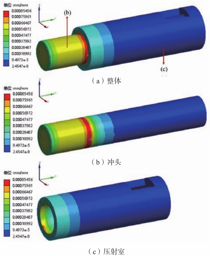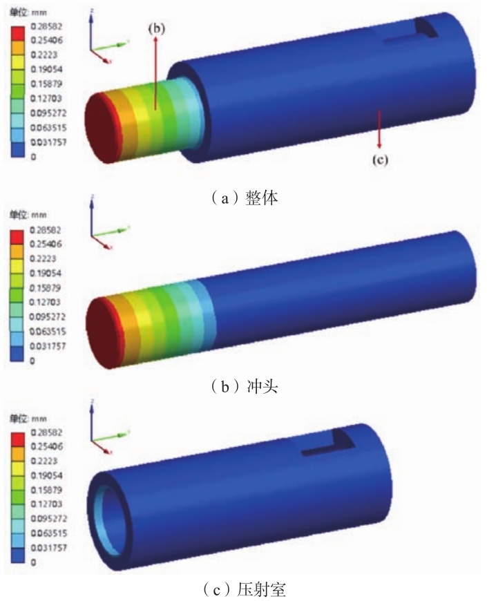 表1 材料參數 (2)設置合理的網格大小及種類進行網格劃分,得到三維模型的有限元分析模型:進行網格劃分,將壓射室、沖頭和液壓缸活塞桿設置網格大小為30 mm,對液壓缸、液壓缸活塞、增壓缸和增壓缸活塞等薄壁部件進行更小尺寸的網格劃分,設置其網格大小為20 mm。統計所得壓射室部分網格節點數為155515個,網格單元為69534個;液壓缸部分網格節點數量為310949個,網格單元數量為125653個;增壓缸部分網格節點數量為310949個,網格單元數量為125653個。 (3)根據各部件受力情況進行受力設置以及邊界約束等條件:各部件均受到標準重力,重力加速度為9.8 m/s²;沖頭右端與其他部件剛性連接設置為固定支撐約束;壓射室、液壓缸、增壓缸、定模板及基座等部件固定,設置為固定支撐約束;壓射保壓過程中,沖頭與金屬液接觸端受到最大保壓力,液壓缸活塞與增壓缸活塞受到來自增壓蓄能器帶來的最大保壓壓力,該三部分接觸面均施加100 MPa的壓力。添加求解模塊(包括變形分析、應力以及應變分析),進行求解計算,并對計算結果進行后處理分析。 3增壓保壓狀態靜力學計算結果分析 3.1 壓射室部分變形、應力、應變分析 壓射室部分的變形云圖如圖6所示。對于沖頭部分,沖頭在與金屬液接觸的部分變形最大,達到0.286mm,變形量從左往右逐漸減小,當超過沖頭長度1/6左右時,變形量降低為0.01 mm左右。這一結果為沖頭設計提供了指導,沖頭既要求有高的熱強性,又要求有高的冷熱疲勞抗力,沖頭部分的材料應使用更為耐熱、耐磨及強度更高的其他材料。為保證沖頭的高強度和高耐性,沖頭制造的工藝流程應該為:鍛造,消除應力回火,粗加工,淬火,精加工。沖頭的長度可取為整桿長度的1/6左右,也就是300 mm左右,沖頭桿的長度取值大約為1 700 mm。對于壓射室,由于其與壓鑄機的定模板剛性固定,設置為固定支撐約束,因此壓射室在保壓過程中變形量較小,最大變形處僅為0.064 mm,產生在壓射室最左端的位置。