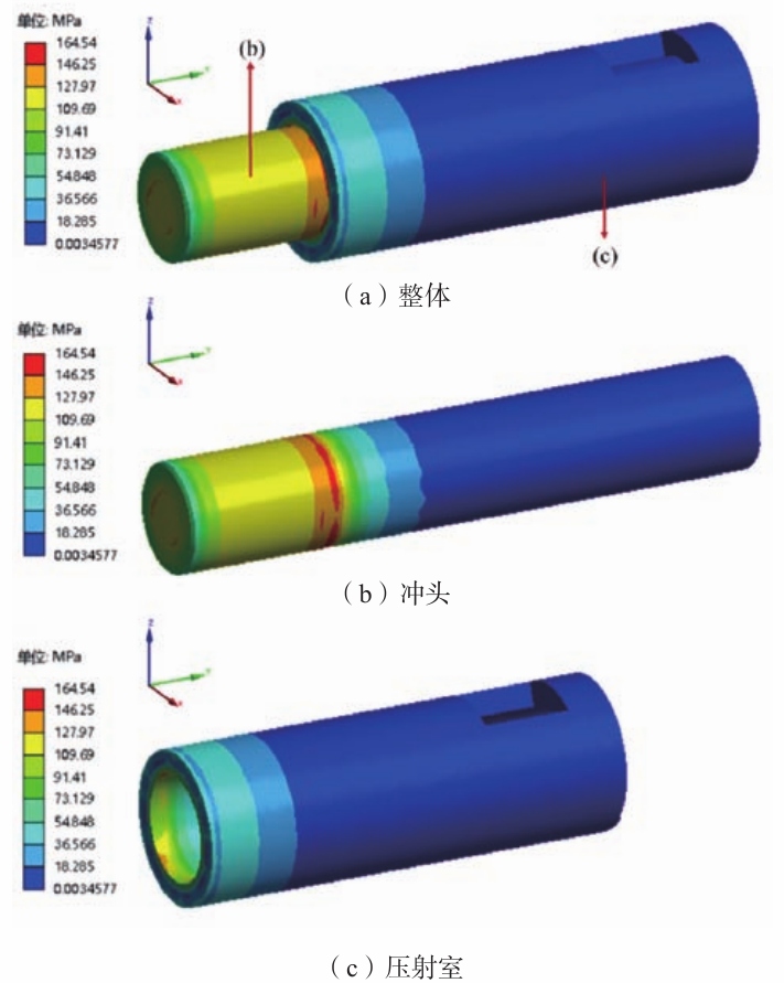 圖6 壓射室部分總變形云圖 壓射室部分的等效應力云圖如圖7所示。可以看出,沖頭在距離左端1/4位置,也就是保壓狀態下與壓射室最左端接觸的位置產生的等效應力最大,其值為164.5 MPa。從沖頭與壓射室左端接觸點開始,向左逐漸減小,端點處最小等效應力值為62.8 MPa,向右也逐漸減小,最小值為0.003 MPa。壓射室等效應力最大值出現在左端面的內徑處,其最大等效應力值為146.3 MPa,往右逐漸減小,當距離左端點距離大致為壓射室整體長度的1/6時,達到最小的等效應力值,為0.003 MPa。
