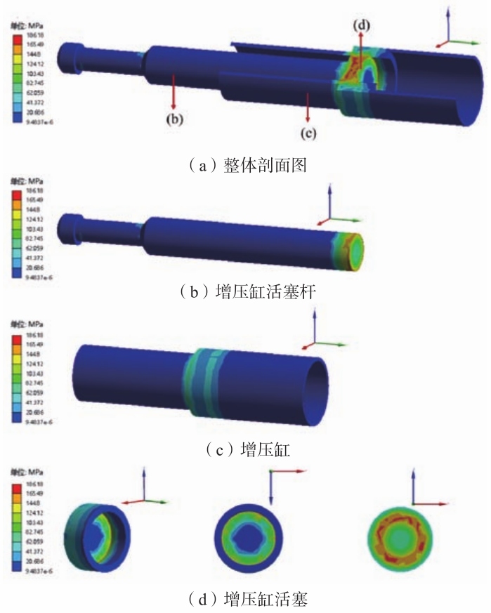 圖12 增壓缸部分總變形云 增壓缸部分所受等效應力云圖如圖13所示。增壓缸活塞桿受到來自右側增壓缸活塞傳遞的壓力,作用在增壓缸活塞桿的右端面。在活塞桿右端面上,等效應力由中心往外增大,中心處最小應力值為62.1MPa,外直徑位置的最大應力值為165.5 MPa。等效應力沿桿的長度方向驟然減小。當距離右端面為整桿長度的1/12時,應力值減小到最小值。增壓缸的等效應力在兩管連接處最大,等效應力最大值為53.6 MPa。增壓缸活塞受到來自增壓蓄能器產生的液壓力,作用在活塞右端面上,等效應力的分布情況為由中心往外逐漸增大,中心最小值為16.8 MPa,邊緣處最大應力值為152.4 MPa。增壓缸活塞左端面與增壓缸活塞桿接觸。由等效應力圖分析可知,活塞左端面接觸活塞桿的端面,最大等效應力出現在增壓缸活塞桿橫截面外圈直徑的位置,其最大值達到186.2 MPa。從活塞對應于活塞桿外圈直徑的位置,沿徑向方向往內逐漸減小,增壓缸活塞的中心位置所受的等效應力大小為41.4 MPa;沿徑向方向往外也逐漸減小,增壓缸活塞的外圈位置所受的等效應力大小為103.3 MPa。