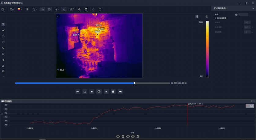 圖1 為了準確定位冷卻過程中出現的問題,本次實驗設計了熱成像監測方案。實驗的核心目標是利用熱成像技術對模具的冷卻過程進行實時監測,及時發現并分析溫度異常區域,特別是銷釘部位的溫度異常情況。 實驗過程中,將使用高精度的熱成像儀對模具各個部位,尤其是銷釘區域進行溫度監控,借助熱成像圖像清晰地顯示溫度分布和變化。通過這種方式,可以直觀地了解溫度是否均勻下降,并對存在異常的部位進行精準定位,進而為后續的冷卻系統調整提供數據支持。 實驗步驟包括: 首先對模具噴涂后的溫度進行基線測量,確保其溫度分布符合預期要求; 接著,在模具冷卻過程中,通過熱成像儀對模具進行連續監控,特別是聚焦在銷釘部位,觀察其冷卻過程中溫度的變化情況。如圖2、3所示