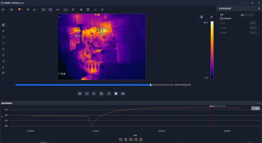 圖4 針對熱成像圖像中反映出的冷卻不均問題,生產團隊對模具冷卻系統進行了整改。通過調整銷釘部位的冷卻通道布局,增加了冷卻液的流量,并重新優化了冷卻液的溫控策略,以確保銷釘區域能夠得到充分的冷卻。整改后,再次使用熱成像儀對同一部位進行監測,結果顯示銷釘區域的溫度降幅符合預期,成功降至了150℃左右。這一變化證明了冷卻系統的調整有效提升了該部位的冷卻效率。 經過整改后的冷卻系統不僅解決了銷釘部位溫度過高的問題,還有效避免了因過高溫度導致的零部件開裂。通過后續的生產驗證,使用熱成像技術監測后的模具冷卻過程更加均勻,零部件的質量得到顯著改善。最終,本次實驗驗證了熱成像技術在發現冷卻系統問題、提升生產質量中的重要作用,并為未來類似問題的解決提供了有效的技術手段。具體實驗結果如圖5所示