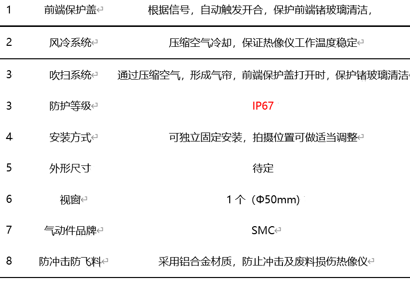 表1 2.2 熱像儀保護罩 為了確保紅外熱像儀在壓鑄工業現場的高溫、油霧和氣霧等嚴酷環境中能夠穩定運行,系統采用了專門設計的IP67級防護熱像儀保護罩。保護罩經過工業現場的嚴苛考驗,具備卓越的密封性和抗污染能力,同時集成了多項功能性設計,全面保障設備的長期穩定運行。保護罩配備風冷冷卻裝置,通過高效散熱技術有效控制設備內部溫度,即使在極端高溫環境中也能維持設備性能。此外,保護罩前端設有氣簾和氣動擋片,可形成清潔的氣流屏障,將油霧和氣霧有效隔離,確保鏡頭表面始終保持清潔狀態,從而避免因污垢導致的成像質量下降。該保護罩的防護性能不僅延長了設備的使用壽命,也保證了模溫監測的精確性和一致性。具體的保護罩性能參數如表2所示: