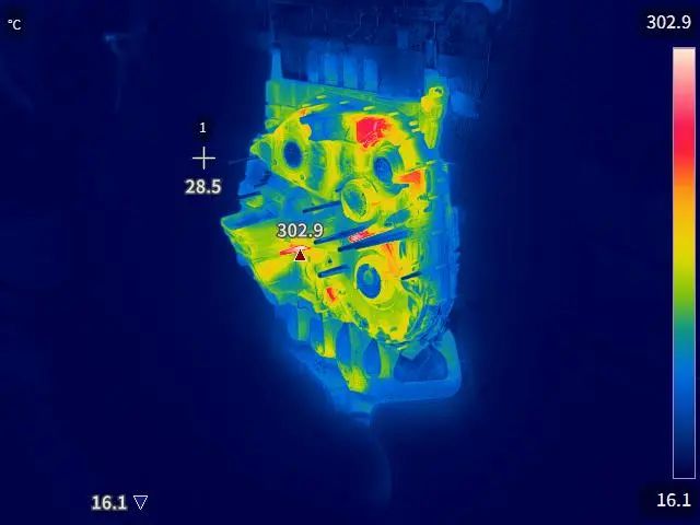 圖3 通過這些數據,能夠及時發現銷釘部位冷卻不均勻或降溫不足的問題。最后,根據熱成像結果,調整模具的冷卻系統,優化冷卻效率,確保模具各部位溫度降至合理范圍內。 3.2 實驗結果 通過實驗,熱成像技術成功地揭示了冷卻過程中存在的問題。在初次使用熱成像儀對模具冷卻過程進行監測時,發現噴涂后的模具表面溫度并未按照預期迅速降至150℃,尤其是在銷釘部位,溫度降幅明顯不足。通過對熱成像圖像的分析,清楚地顯示出銷釘區域的溫度始終維持在200℃左右,遠高于150℃的目標值,導致該部位的金屬材料未能充分冷卻,進而產生了應力集中。這種溫度過高的情況直接導致了零部件的局部開裂現象,且這種問題在生產過程中反復出現,嚴重影響了零部件的質量和生產效率。如圖4所示: