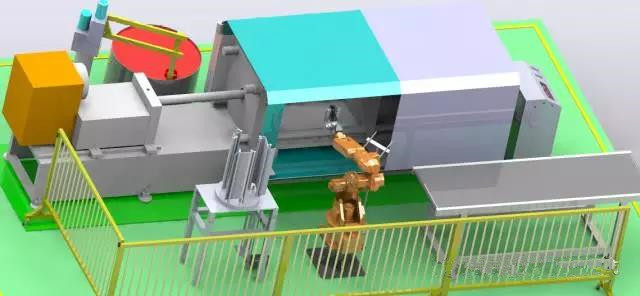 四、伺服噴霧機負責噴霧,機器人取件、檢測、放入切邊機,待切好邊的產品取出放入成品箱,料柄渣包掉入廢料箱。特點:適合于規則對稱產品。如下圖