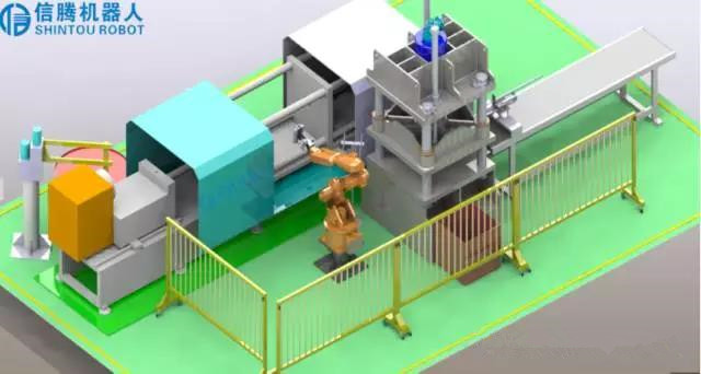 五、機器人取件噴霧一體、檢測、放入切邊機,待切好邊的產品由氣缸下料機械手取出放入輸送線。廢料渣包掉入廢料回爐線。特點:自動化程度高,生產效率高。如下圖