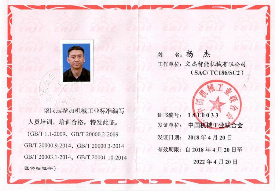 結(jié)業(yè)證書 去年,文杰智能加入成為全國(guó)鑄造機(jī)械標(biāo)準(zhǔn)化技術(shù)委員會(huì)金屬熱成形分技術(shù)委員會(huì)(SAC/TC186/SC2),積極參與鑄造行業(yè)專業(yè)標(biāo)準(zhǔn)的起草。今年4月,公司董事長(zhǎng)楊杰先生參與中國(guó)機(jī)械工業(yè)聯(lián)合會(huì)組織的標(biāo)準(zhǔn)編寫人員培訓(xùn),通過(guò)考試取得結(jié)業(yè)證書,成為壓鑄線性機(jī)器人領(lǐng)域首位獲此證書的專業(yè)人員。 順應(yīng)智能制造的潮流,受益于國(guó)家政策扶持,未來(lái),文杰智能將更加堅(jiān)定壓鑄線性機(jī)器人的步伐和定位,積極作為,為壓鑄行業(yè)發(fā)展添磚加瓦,朝向行業(yè)領(lǐng)導(dǎo)者的目標(biāo)不斷前進(jìn)。 溫馨提示:“2018中國(guó)國(guó)際壓鑄會(huì)議暨展覽會(huì)(CHINA DIECASATING)”將于7月18-20在上海新國(guó)際博覽中心舉行,文杰智能將攜最新壓鑄線性機(jī)器人產(chǎn)品及應(yīng)用解決方案出席,屆時(shí)歡迎行業(yè)同仁蒞臨參觀指導(dǎo)。展位號(hào):N1D32 |
