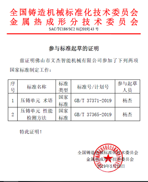 ![]() 文杰壓鑄線性機(jī)器人 “一流企業(yè)做標(biāo)準(zhǔn)”,這已是各行業(yè)企業(yè)的共識。參與標(biāo)準(zhǔn)制定的企業(yè),是游戲規(guī)則的制定者,行業(yè)的標(biāo)桿或領(lǐng)頭羊,可以讓自身保持在業(yè)內(nèi)的領(lǐng)先優(yōu)勢。與此同時,參與行業(yè)標(biāo)準(zhǔn)制定,用標(biāo)準(zhǔn)來規(guī)范企業(yè)行為,推動行業(yè)發(fā)展,促進(jìn)技術(shù)進(jìn)步,也是企業(yè)法人踐行社會責(zé)任的舉措。 佛山市文杰智能機(jī)械有限公司(“文杰智能”)積極參與壓鑄行業(yè)各類標(biāo)準(zhǔn)制定。2017年,更是加入全國鑄造機(jī)械標(biāo)準(zhǔn)化技術(shù)委員會金屬熱成形分技術(shù)委員會(TC186/SC2),在TC186/SC2領(lǐng)導(dǎo)下,與會員單位一道參與多項(xiàng)行業(yè)標(biāo)準(zhǔn)的起草,成為包括《壓鑄單元 術(shù)語》GB/T 37371-2019、《壓鑄單元 性能檢測方法》GB/T 37365-2019國家標(biāo)準(zhǔn)的起草單位。