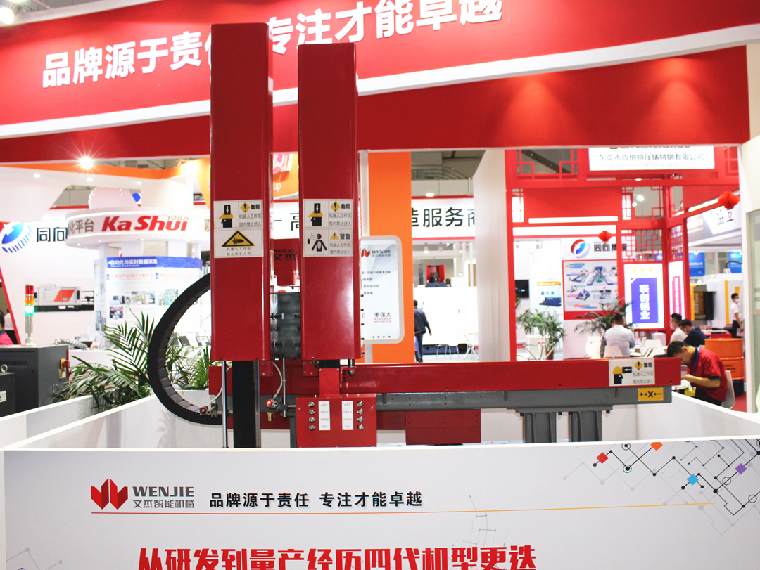 WJC-900線性機器人 據了解,文杰智能擁有WJC線性機器人重型壓鑄機專用系列、WJA線性機器人輕型壓鑄機專用系列,以及WJB系列線性機械手輕型壓鑄機專用系列。楊杰先生表示:“近年來,文杰受國標委委托,起草壓鑄線性機器人(手)標準,清晰明確界定線性機器人、線性機械手。比如,線性機器人,可對標關節機器人,重復精度在5μm-10μm,具有取件、噴霧、冷卻、碰渣包、碼垛、鑲件、切邊等功能;線性機械手,重復精度則在1mm左右,主要用于取件、噴涂。” 據介紹,此次展示的WJC線性機器人適用于合模力9000KN以上大型壓鑄機,標配6個伺服軸實現多軸聯動運行,垂直軸標配可伸縮的串聯結構滿足較低的高度要求,夾手可使用1-2個啟動軸或伺服旋轉軸控制。其噴霧箱采用模塊式或箱式選配擴展、可調節分組控制,進口直線導軌和高精度減速機配合實現重復定位精度高。國際品牌控制系統驅動伺服電機能快速、高效穩定運行,取件機、噴霧機可同時或獨立運行,大大縮短整機工作時間,提升工作效率精度,重復精度±5μm范圍內。