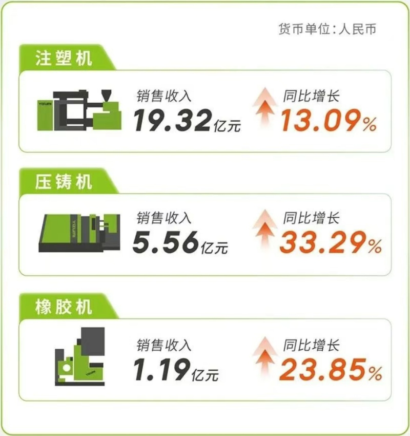 壓鑄機業務:作為公司重點發展板塊之一,上半年實現銷售收入5.56億元,同比增長33.29%,占總營收比重達20.24%。增長主要得益于新產品成功推出后市場反響熱烈,銷量快速攀升。近年來,公司不斷豐富產品系列,涵蓋冷室壓鑄機(中小型、重型、超大型)、熱室專用機型及鎂合金系列(熱室鎂合金壓鑄機、半固態注射成型機等),并推出全新NEXT2系列兩板式壓鑄機,成功研發并交付6600T半固態鎂合金注射成型機,進一步鞏固了技術領先地位。 注塑機業務:作為公司最大業務板塊,上半年實現銷售收入19.32億元,同比增長13.09%,占總營收70.34%。增長主要得益于運營效率持續提升、銷售力度不斷加大,整體市場競爭力進一步增強。 此外,作為三大核心業務之一的橡膠機業務,上半年實現銷售收入1.19億元,同比增長23.85%,表現亮眼。主要得益于橡膠機事業部經營態勢良好,訂單飽滿,同時海外業務拓展迅速,國際市場占有率穩步提升。