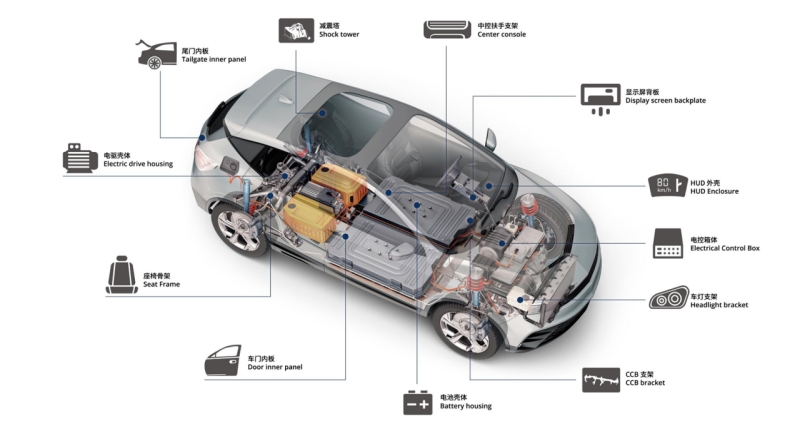 典型汽車領域產品: 1、屏幕背板:采用鎂合金注射成型,擁有更好的內部質量、尺寸精度、以及輕量化效果。工藝范圍覆蓋單屏、雙聯屏以及貫穿式超長屏等全品類。 2、CCB儀表盤支架:全球多家OEM廠商采用輕量化一體結構,重量3.6-4.8kg,較傳統鋼制件減重約3kg,鎂合金注射工藝帶來更高的尺寸精度,同時滿足多功能安裝需求。 3、尾門內板:可通過超大型鎂合金雙注射成型技術集成幾十個零件,減少繁雜工序,預計減重超過20%。