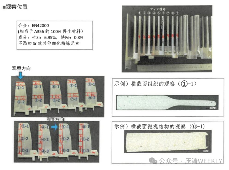 ![]() 原標題:技術驗證:宇部對康普泰克流變壓鑄法的微觀結構表現分析 宇部興產機械株式會社(UBE Machinery)近期對康普泰克(Comptech)Rheocast 流變壓鑄法生產的散熱器翅片進行了系統的微觀結構分析,其結果為高性能薄壁鑄件制造提供了重要技術參考。 本次分析對象為高度 105mm、頂部寬度 0.8-1.0mm、斜度 0.5-1° 的散熱器翅片,采用 EN42000 合金材質 —— 該材質為 A356 的 100% 再生材料,含硅 6.95%、鐵 0.3%,且未添加 Sr 等細化精煉元素。通過微觀觀測發現,翅片從 3mm 厚底部至 1mm 厚頂端的全域組織呈現高度均質性:基體由粒徑約 50μm 的初生鋁球狀顆粒構成,顆粒間隙分布極細 α 相鋁,二者間隙中則形成共晶硅結構(灰色區域),整體僅含少量卷氣與縮孔,金屬包裹完整性優異。