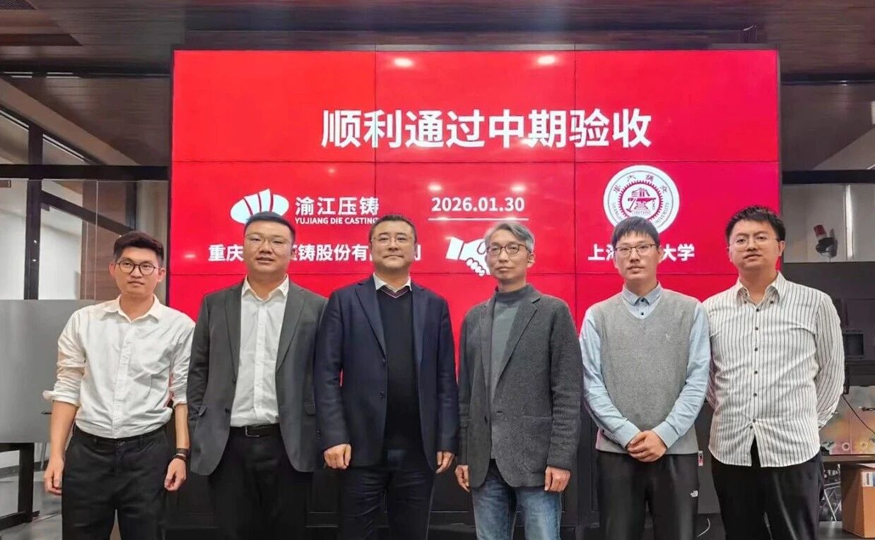 階段性目標的達成,為后續機型試制與規模化工藝驗證奠定了堅實基礎。下一步,雙方將著力推進成型過程的智能化控制、缺陷在線監測與工藝-材料-裝備的全局協同優化,加速實現技術從實驗室到產業化的跨越。 02.「協同賦能」 產業鏈閉環驅動技術高效轉化 隨后,上海交通大學與渝江壓鑄的合作項目順利通過中期評審。本次驗收聚焦于技術成果向規模化生產場景的轉化路徑,雙方圍繞量產過程中的工藝窗口優化、質量一致性控制以及綜合成本管理等關鍵議題,開展了深入且務實的交流。