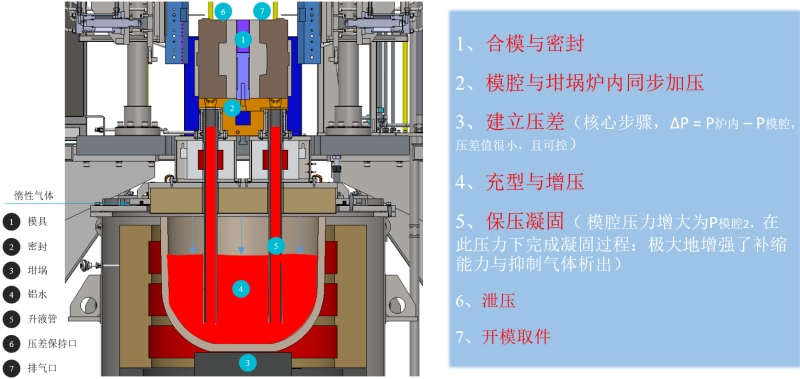 慧臻科技無氧鑄造成型機的工作流程 據了解,這款無氧鑄造成型機的核心亮點在于采用可控壓差實現鋁液平穩充型與高壓凝固,從根源上提升鑄件致密度與力學性能。其工作原理為:先通過較小壓力將鋁液經升液管注入模腔,再精準控制金屬液面與模腔內部的壓力差完成充型,最后在高壓環境下實現凝固結晶,同步完成高壓凝固與塑性變形,促使鑄件晶粒細化、組織致密。 相較于傳統鑄造工藝,該設備優勢顯著:相較于重力鑄造,鑄件致密度提升30%以上,晶粒尺寸顯著減??;相較于高壓壓鑄,無需依賴高壓射速度,避免卷氣疏松問題,且支持T6熱處理,力學性能可達同種合金鍛件水平,完美適配汽車受力件、耐壓件等關鍵構件的輕量化需求。 在工藝設計上,該設備采用全閉環控制的七步標準化工作流程,涵蓋合模密封、同步加壓、壓差建立、充型增壓、保壓凝固、泄壓、開模取件等關鍵環節,所有核心工藝參數可通過工業互聯網系統實時監控、全程追溯,滿足汽車行業嚴苛的質量管控標準。同時,設備融入多項創新技術,可柔性適配不同結構產品鑄造需求,換型時間縮短至30分鐘以內;8段電子比例閥實現高精度壓力控制;智能化人機交互界面讓操作更便捷,伺服節能系統則使能耗較傳統設備降低25%以上。