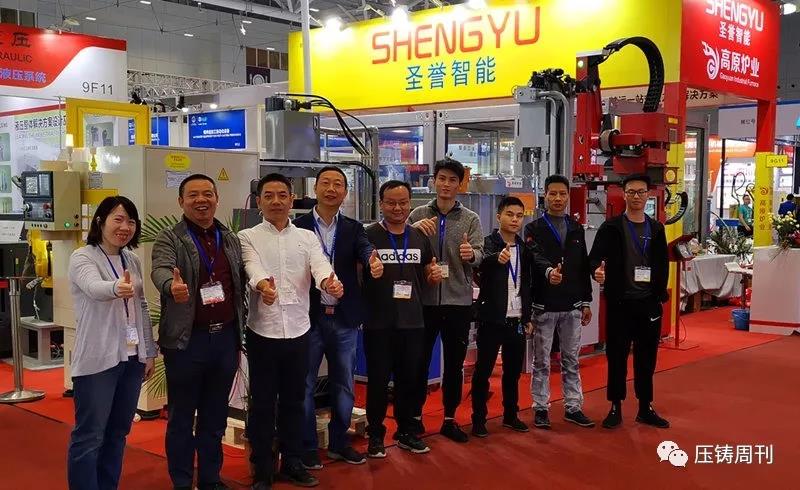廣東圣譽參展團隊,左4為公司董事長劉繼文先生、左2總經(jīng)理羅圣科先生 QFZ系列壓鑄機系廣東圣譽聯(lián)合中山繼文五金塑料制品有限公司、佛山市蕎帆機電科技有限公司共同研制。劉繼文先生表示:“廣東圣譽運用其對壓鑄加工工藝了解透徹的專長,結合中山繼公司近30年的壓鑄生產創(chuàng)新理念、實踐經(jīng)驗,并配合佛山市蕎帆機電科技有限公司團隊對機械自動化探索和創(chuàng)新能力,三家公司在體驗中通過理解和邏輯思維、科學原理和規(guī)律,通力合作研制了簡潔、實用、多用途的創(chuàng)新型產品——立射式冷/熱室雙重功能壓鑄機。” 生產效率高,鑄件質量好 該特種壓鑄機,壓射機構采用立式射料設計,利用反向活塞原理,可最大限度實現(xiàn)射料過程無空氣卷入,允許模具在打開的情況下完成給湯動作,并在擠出殘留部分尚未完全凝固的情況下以頂起方式取出成品壓鑄件。這使得壓鑄件質量大幅提升,生產周期大大縮短,經(jīng)濟效益明顯提高。