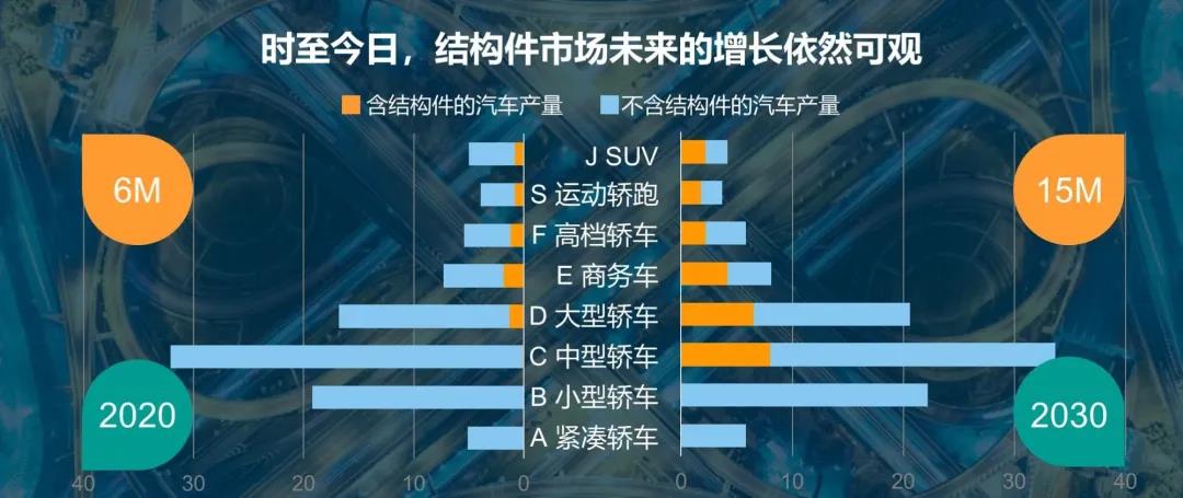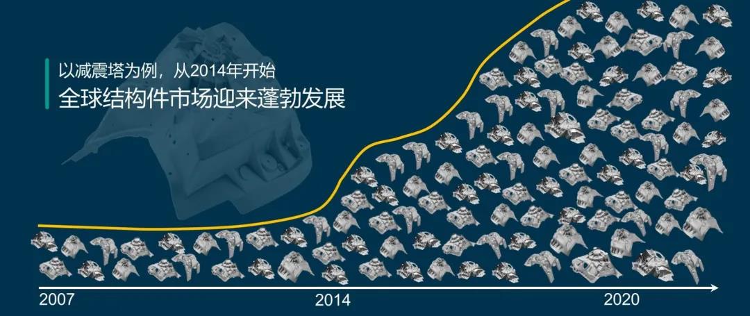 本次發布會分別以德語、英語、中文在全球同步播出,中文頻道由布勒壓鑄亞太區總監盧敏先生和產品管理部經理王思寧先生主持發布,演講環節分為全球壓鑄市場分析和布勒最新產品介紹兩部分。 未來可期:結構件市場蒸蒸日上 1993年,隨著奧迪A8車型的發布,為了減輕車身重量,奧迪考慮以鋁合金替代傳統的鋼結構,結構件市場應運而生。之后在歐系高端品牌汽車的帶領下,結構件的應用越來越多,比如減震塔、A柱、B柱、縱梁、門框等,但也僅限于高端車型。直到結構件在奔馳C級車上的數量達到7個,標志著結構件從此進入量產時代。 在歐洲市場得到初步的驗證后,北美、亞洲的結構件市場也逐步發展起來。以減震塔為例,從2014年開始,全球結構件市場迎來蓬勃發展,各大汽車品牌紛紛大量使用結構件。如今,不僅結構件的數量不斷增加,而且其種類也日益豐富。