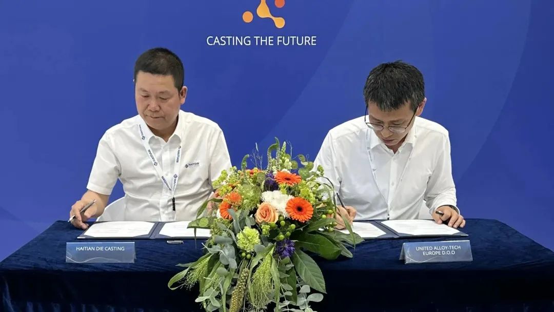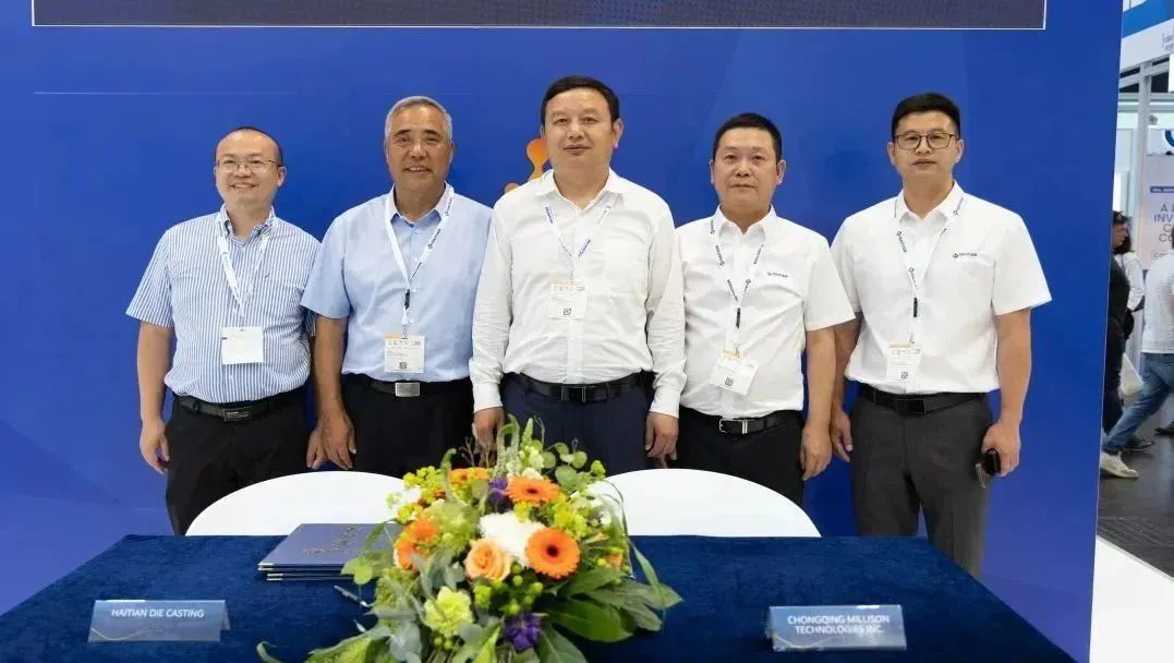 雙方簽約及來賓合影 美利信科技總部位于中國重慶,主要從事通信領域和汽車領域鋁合金精密壓鑄件的研發與生產。多年來,海天金屬與美利信科技達成緊密的戰略合作伙伴關系。本次GIFA展上,雙方共同簽署了全球戰略合作協議,宣布將聯合開發20000噸超大型壓鑄機設備,并將在大型及超大型壓鑄領域展開研發技術合作,實現成果共享。 強強聯合 助推新能源汽車行業高質量發展