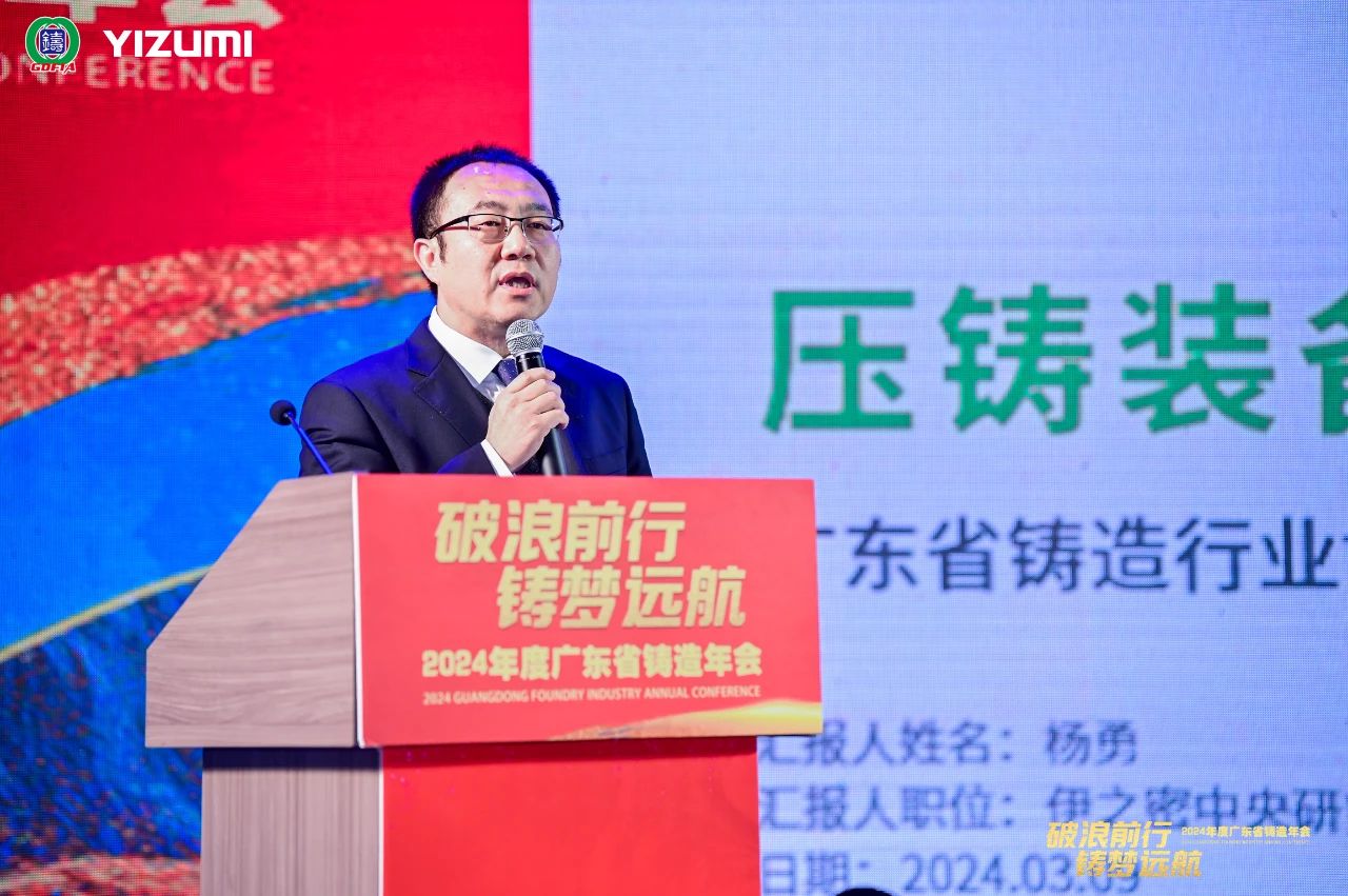 在參觀過程中,嘉賓們對(duì)壓鑄產(chǎn)業(yè)的前沿技術(shù)有了更深入的了解,還對(duì)伊之密在技術(shù)創(chuàng)新、產(chǎn)品研發(fā)以及市場(chǎng)拓展等方面的努力和成果表示高度贊賞。 聚焦前沿 共話壓鑄產(chǎn)業(yè)的創(chuàng)新路徑 當(dāng)天下午,伊之密股份有限公司中央研究院執(zhí)行院長(zhǎng)楊勇博士、伊之密股份有限公司壓鑄機(jī)事業(yè)部半固態(tài)市場(chǎng)經(jīng)理陳勇先生分別受邀參加廣鑄協(xié)年會(huì)開幕式及學(xué)術(shù)交流論壇,并在會(huì)上分別做主旨報(bào)告和專題報(bào)告。 ? 楊勇 伊之密股份有限公司中央研究院執(zhí)行院長(zhǎng) 《壓鑄裝備企業(yè)創(chuàng)新體系建設(shè)實(shí)踐》 當(dāng)今時(shí)代,技術(shù)創(chuàng)新是企業(yè)核心競(jìng)爭(zhēng)力的重要來(lái)源。為確保創(chuàng)新可持續(xù)、常態(tài)化和成功率,企業(yè)需要建立、實(shí)施、保持現(xiàn)代創(chuàng)新管理體系。對(duì)此,伊之密股份有限公司中央研究院執(zhí)行院長(zhǎng)楊勇博士帶來(lái)《壓鑄裝備企業(yè)創(chuàng)新體系建設(shè)實(shí)踐》的主旨報(bào)告。
