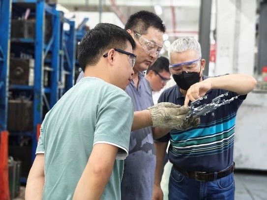 ◆ 講解模具設(shè)計知識 隨著業(yè)務(wù)的快速發(fā)展,2024年,索斯科(深圳)再次增購一套富來冷室壓鑄島,包括富來冷室壓鑄機QC380及全套自動化周邊設(shè)備,實現(xiàn)了其在更大鑄件的生產(chǎn)能力上的提升。經(jīng)過2周緊鑼密鼓的安裝、調(diào)試、培訓(xùn)工作,此套富來QC380冷室壓鑄島已快速投入量產(chǎn)中。