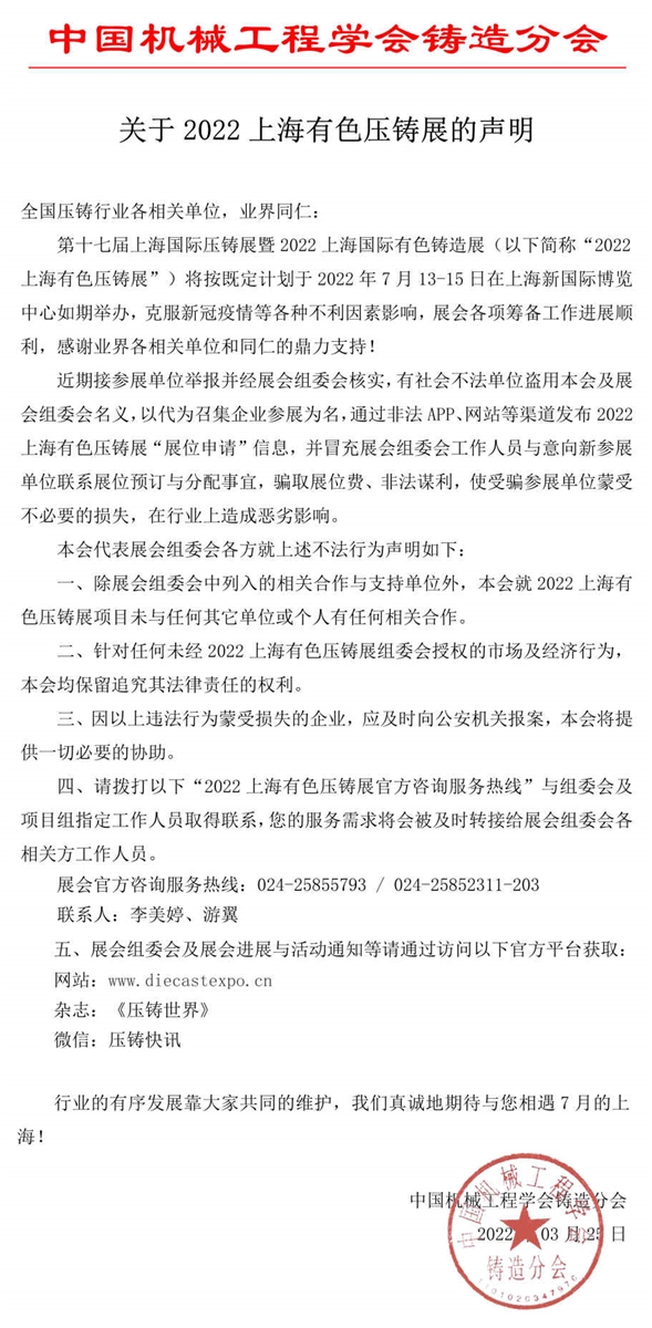 關于2022上海國際壓鑄展的聲明