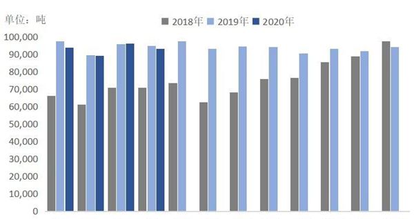 2020年1-11月,中國共產(chǎn)原鎂77.07萬噸,同比下降0.47%。2020年,國內(nèi)鎂消費量預計48.5萬噸左右,同比基本保持一致。