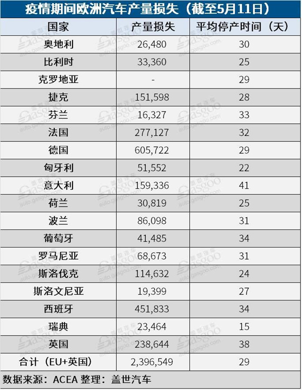 根據(jù)歐洲汽車工業(yè)協(xié)會(ACEA)整理的數(shù)據(jù),從3月中旬至5月11日,歐盟范圍內(nèi)因疫情關閉工廠造成的產(chǎn)量損失已達2396549輛。