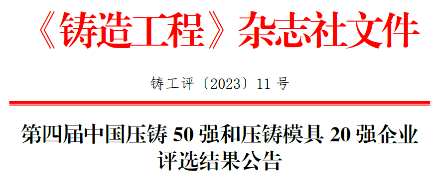 《鑄造工程》評選出第四屆中國壓鑄50強、壓鑄成長之星和壓鑄模具20強企業。