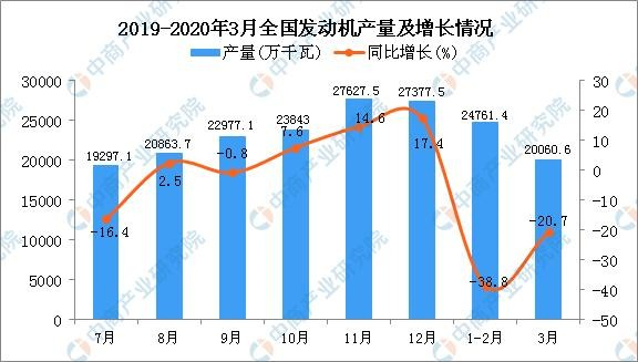 2020年1季度全國發動機產量有所下降,3月全國發動機產量為20060.6萬千瓦,同比下降20.7%。