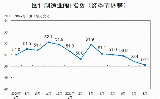 8月份,中國制造業采購經理指數為50.1%,比上月回落0.3個百分點,繼續保持在擴張區間。