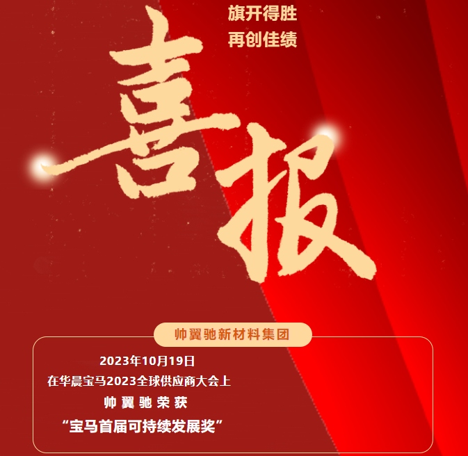 2023年10月19日,在華晨寶馬2023全球供應(yīng)商大會上,帥 翼 馳 榮 獲“寶馬首屆可持續(xù)發(fā)展獎”。