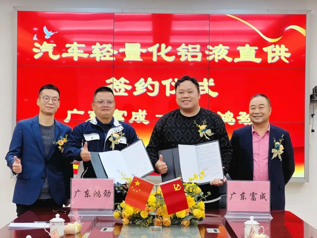 2024年3月4日,廣東鴻勁金屬鋁業(yè)有限公司與廣東富成聯(lián)合金屬制品有限公司就汽車輕量化項(xiàng)目鋁液供應(yīng)進(jìn)行隆重簽約儀式。