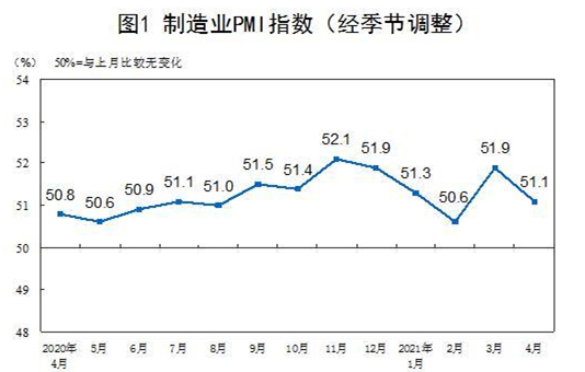4月份,中國制造業(yè)采購經(jīng)理指數(shù)(PMI)為51.1%,低于上月0.8個(gè)百分點(diǎn),仍高于臨界點(diǎn),制造業(yè)繼續(xù)保持?jǐn)U張態(tài)勢。