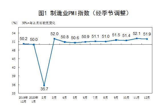2020年12月份,中國制造業(yè)采購經(jīng)理指數(shù)(PMI)為51.9%,雖比上月回落0.2個(gè)百分點(diǎn),但連續(xù)10個(gè)月位于臨界點(diǎn)以上,表明制造業(yè)繼續(xù)穩(wěn)步恢復(fù)。