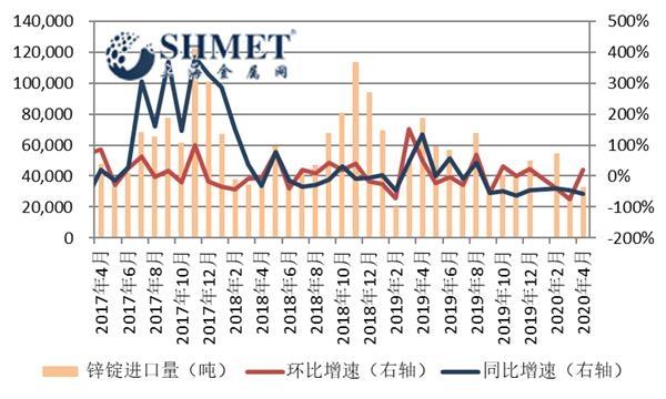 4月,中國進(jìn)口精煉鋅32790噸,環(huán)比增加19.02%,同比下降57.74%;出口2919噸,環(huán)比下降44.5%,同比增加152.5%。