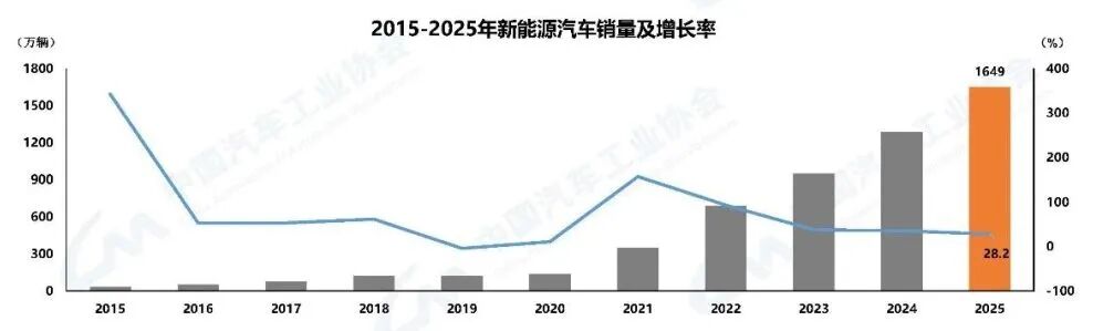 新能源汽車依舊是行業(yè)增長(zhǎng)的核心動(dòng)力,我國(guó)新能源汽車產(chǎn)銷量已連續(xù)11年位居全球第一。2025年,在政策利好加持、產(chǎn)品供給豐富、基礎(chǔ)設(shè)施持續(xù)完善等多重積極因素共同作用下,新能源汽車市場(chǎng)持續(xù)擴(kuò)容,產(chǎn)銷量成功突破1600萬(wàn)輛,分別完成1662.6萬(wàn)輛和1649萬(wàn)輛,同比分別增長(zhǎng)29%和28.2%。值得關(guān)注的是,2025年新能源汽車新車銷量占汽車新車總銷量的比例達(dá)47.9%,較去年同期提升7個(gè)百分點(diǎn),產(chǎn)業(yè)電動(dòng)化轉(zhuǎn)型進(jìn)程持續(xù)加速。
