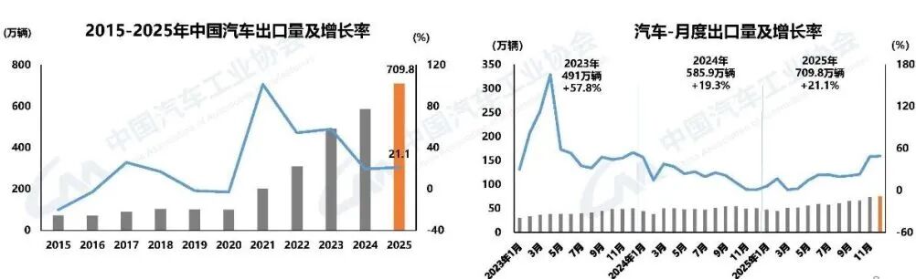 海外市場(chǎng)開拓成效顯著,成為拉動(dòng)行業(yè)增長(zhǎng)的另一重要引擎。2025年,國(guó)內(nèi)汽車企業(yè)愈發(fā)重視海外市場(chǎng)布局,中國(guó)品牌國(guó)際競(jìng)爭(zhēng)力持續(xù)提升,合資企業(yè)出口同樣表現(xiàn)亮眼,疊加新能源汽車出口的快速增長(zhǎng),推動(dòng)我國(guó)汽車出口再上新臺(tái)階。全年汽車出口量達(dá)709.8萬(wàn)輛,首次突破700萬(wàn)輛大關(guān),同比增長(zhǎng)21.1%。其中,新能源汽車出口表現(xiàn)尤為突出,全年出口261.5萬(wàn)輛,同比激增1倍,成為出口增長(zhǎng)的核心驅(qū)動(dòng)力。