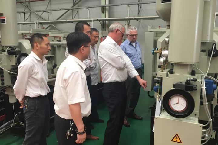 來自歐洲的客戶前來考察固德威工廠 據介紹,“一種鎂合金冷室壓鑄機的快壓射截止機構”是廣東固德威的一項創新型發明專利技術,使用了該技術的GDC300SM冷室壓鑄機,在很小的插裝閥開度下,便可達到所需的建壓時間15ms。在生產鑄件時,更快速的建壓過程,同時閥開度范圍更廣,更易控制。運用該新技術,使得生產小件鑄件時,在較小的閥開度情況下,就可以生產出高合格率的鑄件,避免了由于閥開度過大,導致小鑄件披風、毛刺過多的問題。