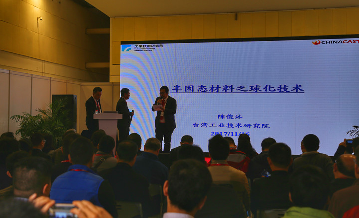 楊歡演講“尖端金屬鑄造數(shù)學模型” 臺灣工業(yè)技術研究院陳俊沐博士以“半固態(tài)材料之球化技術”為題做演講。陳俊沐先生介紹,半固態(tài)成型可減少亂流氣孔,與凝固收縮孔缺陷,且具有細致化鑄造組織,其機械性能可接近鍛造件。傳統(tǒng)鑄造材料進行半固態(tài)成型,其樹枝狀晶組織會造成壓鑄過程的固液分離,進而造成成份偏析,球化材料則較少偏析。