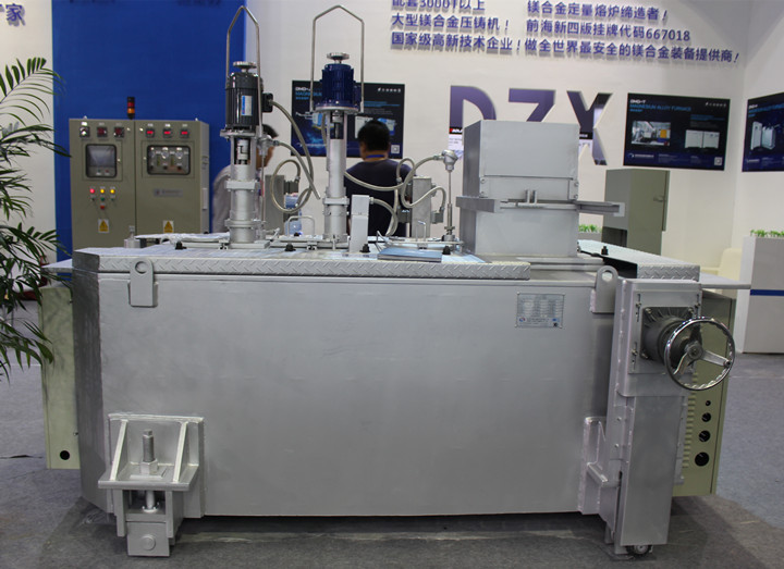 噴霧取件兩用線性機器人 東莞海瑞的噴霧取件兩用的線性機器人(HRX-900),運用了氣動旋轉與穩定的大尺寸伺服軸設計,高精度垂直軸與伸縮串聯結構,全伺服馬達驅動,特殊的軟件程序控制,可實現壓鑄機與線性機器人同步移動,縮短生產循環周期。 另外,東莞海瑞還展示了多連桿高速取件機(HRQ-02),該機型采用進口減速電機驅動手臂,PLC與變頻控制,手臂可在其行程范圍內任意點待機,在開模前手臂提前行進模具邊緣,有效縮短取出時間,提高生產效率。可單動,也可與給湯機、噴霧機連線成全自動化設備。 深圳鼎正鑫,研制安全易用的鎂熔爐 在本屆展會上,深圳市鼎正鑫科技有限公司(“深圳鼎正鑫”)展示一套設計新穎、安全可靠的鎂合金熔化保溫爐DV系列 DV500型,采用了多項自主專利技術,可大幅度提升鎂合金熔體的安全性、簡便性。