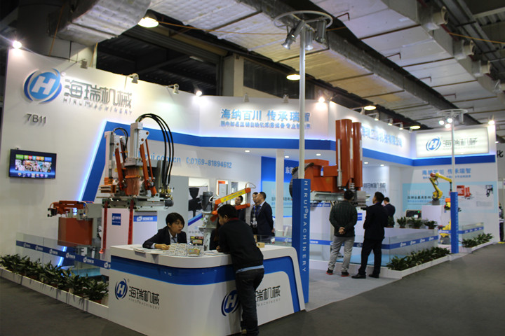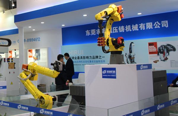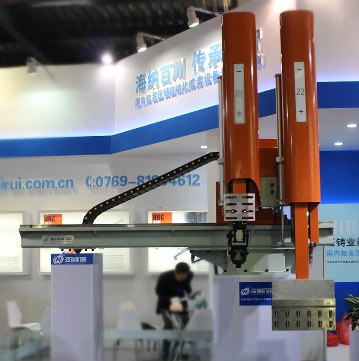 億翔模溫機系列 據介紹,深圳億翔開發的溫控設備,控溫范圍在-60℃至+400℃,且全系列提供防爆選擇,特殊溫度控制定制化服務。壓鑄模溫機具有開機自動排氣,最高使用溫度350℃;采用特殊管路系統設計,導熱油不氧化,使用壽命長;無軸封磁力驅動泵,耐溫350℃,避免泄漏;智能化操作模式,報警提示,操作簡便;安全保證完善,故障顯示,維修,保養無需專業人員。適用于鋁鎂鋅合金壓鑄、高溫熱壓成型模具、半固態壓鑄模具的控溫。 深圳億翔展示的水循環溫度控制機,具有安全、自動排氣、操作簡便等特點,該設備配置系統安全閥,不銹鋼管路一體成型,減少管阻及銹垢;顯示出水、回水溫度,最高使用溫度120℃,并設有熱水BY-PASS泄壓回路;電器部分均采用國際品牌等原廠正品配件。 東莞海瑞伺服機械手,助力壓鑄自動化生產 東莞市海瑞機械有限公司系行業知名的壓鑄周邊設備提供商,公司素來以“精密、穩定、耐用”為設計和制造理念,為用戶提供高品質的給湯、噴霧、取件機械手設備。展會上,東莞海瑞展示了5套伺服壓鑄周邊設備,包括不同型號的多款給湯機、噴霧機系列、線性機器人,助力壓鑄過程的全自動化生產。
