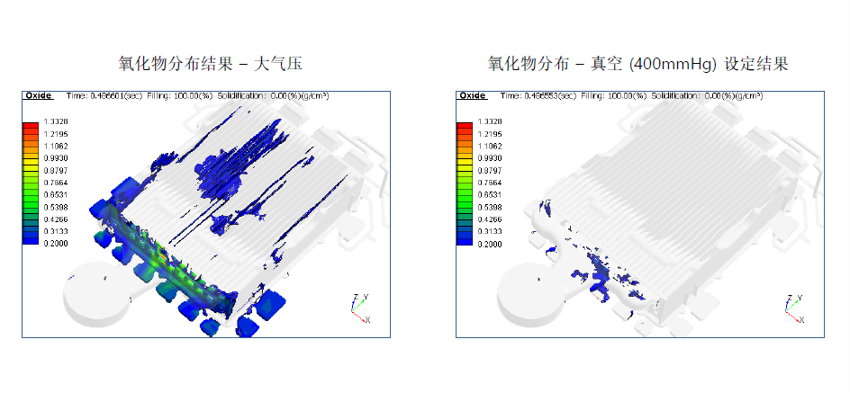 考慮到真空(氣體壓力)的氧化夾渣生產與追蹤的改善,將氧化夾渣的預測結果準確性提升。 Air Pressure 運算法則改善 追蹤金屬液和空氣接觸的自由表面的運算法則被改善。通過使用這個改善后的運算法則來求解計算,預測Air Pressure結果孤立氣體的發生區域的準確性被提升。