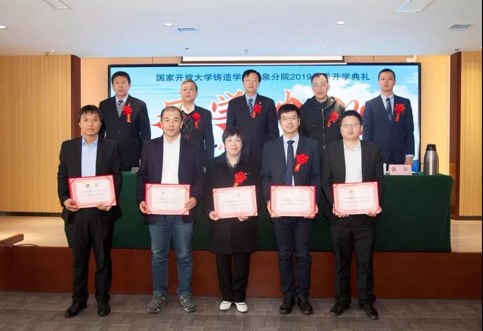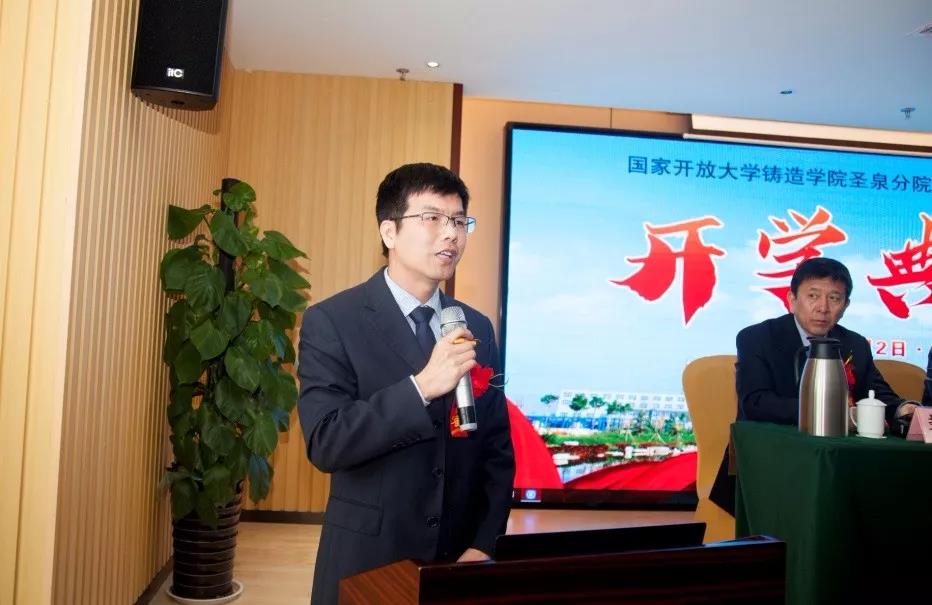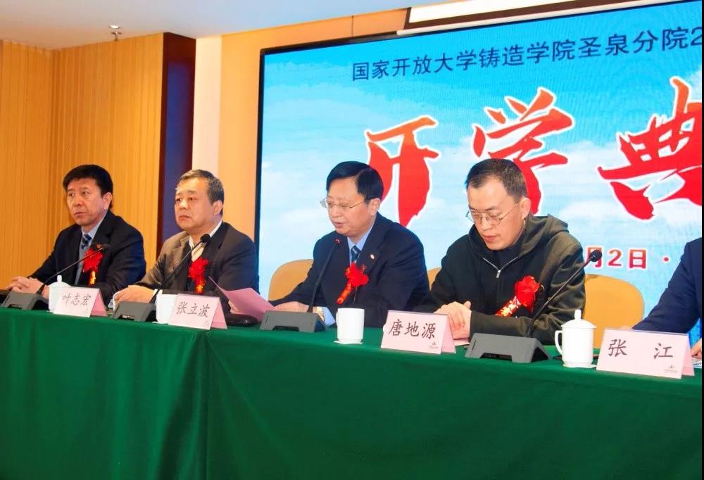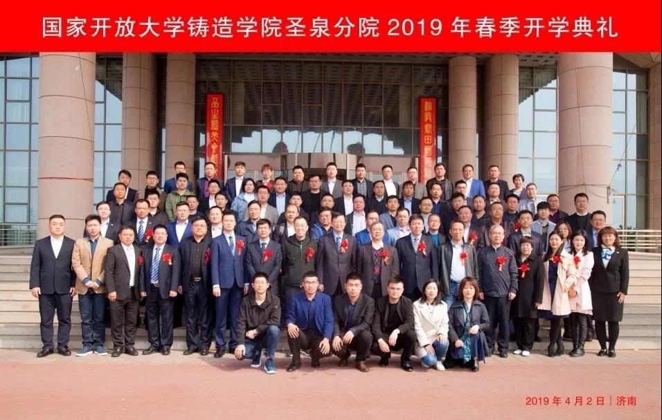 ![]() 開學典禮由圣泉分院常務副院長王軍主持,并全程進行了網絡直播。典禮在莊嚴的國歌聲中開始。 4月2日上午,國家開放大學鑄造學院圣泉分院2019春季開學典禮在濟南隆重舉行。中國鑄造協(xié)會會長、國家開放大學鑄造學院院長張立波,中國鑄造協(xié)會副監(jiān)事長、國家開放大學鑄造學院執(zhí)行副院長支曉恒,國家開放大學教務部部長葉志宏,國家開放大學教務部副部長鄭潔,圣泉集團總裁兼圣泉分院院長唐地源,山東鑄造協(xié)會秘書長張江,中國鑄造協(xié)會職教中心主任景立文,鑄造學院院長助理李子軍,國家開放大學教務部考風考紀科科長潘焦萍,國家開放大學教務部合作辦學辦公室副主任王國鵬,圣泉集團副總裁祝建勛,圣泉集團工業(yè)品營銷總監(jiān)薛峰,圣泉集團鑄造材料銷售總監(jiān)袁永等領導出席典禮。本次典禮還特邀山東省重要鑄造企業(yè)領導出席:濟南重汽集團濟南動力有限公司總經理安波、煙臺勝地汽車零部件制造有限公司副總經理鄭云霞、山東豪邁機械科技股份有限公司鑄造事業(yè)部總經理姚遠、玫德集團玫德大學院長陳蔚、山東匯豐鑄造科技股份有限公司總經理劉慶坤、淄博乾能鑄造科技有限公司董事長王峰、山東豐晃鑄造有限公司總經理趙學通、山東銀鷹炊事機械有限公司總經理李忠民。 張立波會長在開學典禮上作了重要發(fā)言,他指出,中國鑄造協(xié)會與國家開放大學合作成立鑄造學院,旨在為鑄造行業(yè)提供人才學歷和能力提升的渠道,圣泉作為鑄造材料的大型生產企業(yè),規(guī)模產能位居世界前列,圣泉分院的成立,為在職員工提升學歷和技術水平提供了優(yōu)質平臺,必將推動山東省鑄造行業(yè)的人才培養(yǎng)。張會長把第一期學生比喻為“黃埔一期”學員,他們將實現(xiàn)不離崗、不離廠的“大學夢”。