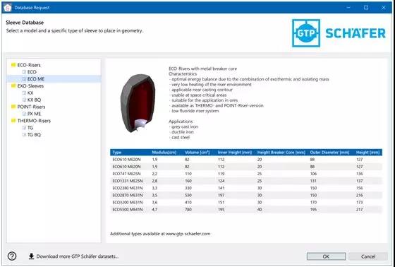 有了 GTP Schäfer 標準產品系列的數據,鑄造廠可以選擇模數在 0.7 到 5.0 cm 之間的任意冒口;這些數據存儲在MAGMASOFT® 5.4的數據庫中。作為標準產品系列的補充,雙方還開發了一個在線接口用來連接 MAGMASOFT®和“GTP 工具箱”的數據,這樣,用戶就可以將開發的特殊冒口產品組合數據導入到MAGMASOFT®中。用戶友好的數據工具箱可以讓您非常方便地訪問2D和3D的冒口、保溫套及易割片砂芯的幾何結構,這也就意味著,客戶不再需要花費大量精力來創建各種數據文件,可以直接從GTP工具箱或者GTP的網站來查看最新版的數據。 |