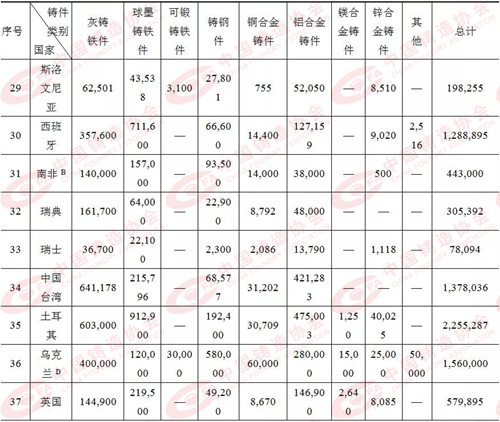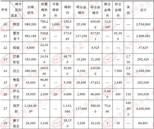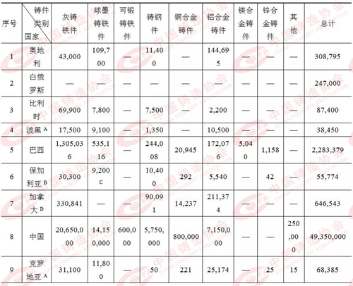 注:A)2016年數據 B)2017年數據 C)包含球墨鑄鐵 D)2015年數據 E)包含所有有色合金 F)包含鋅合金 G)包含所有鐵合金 表2:2018年各國/地區鑄造企業數