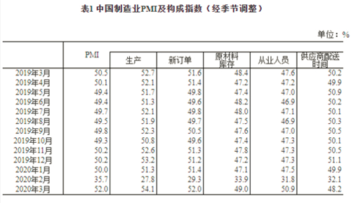 ![]() 據國家統計局網站消息,2020年3月份,中國制造業采購經理指數(PMI)為52%,比上月回升16.3個百分點。3月份,我國疫情防控形勢持續向好,生產生活秩序穩步恢復,企業復工復產明顯加快。 截至3月25日,全國采購經理調查企業中,大中型企業復工率為96.6%,較2月調查結果上升17.7個百分點。3月,21個制造業行業PMI均有不同程度回升,總體呈現出市場供需有所改善、政策效應逐步顯現、新動能恢復較快等特點。