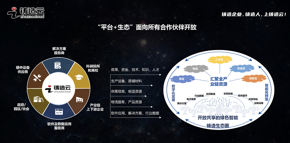 此外,在此次發(fā)布會(huì)上,為了更好地推動(dòng)鑄造行業(yè)綠色智能和高質(zhì)量發(fā)展,鑄造云還啟動(dòng)了“鑄造智變·云啟未來(lái)”——鑄造云生態(tài)合作伙伴招募計(jì)劃,邀請(qǐng)軟件及數(shù)據(jù)應(yīng)用服務(wù)商、解決方案服務(wù)商、硬件設(shè)備供應(yīng)商、鑄造上下游企業(yè)、高校和科研院所、政府/園區(qū)/協(xié)會(huì)等共建“商流、物流、人才流、資金流、信息流” 五流合一的綠色智能鑄造生態(tài)圈,力爭(zhēng)將鑄造云打造成一個(gè)千億級(jí)的交易平臺(tái)、萬(wàn)家鑄造企業(yè)活躍的行業(yè)社群、千家合作伙伴受益的生態(tài)圈層、百家高校和科研院所匯聚的研發(fā)平臺(tái)。
