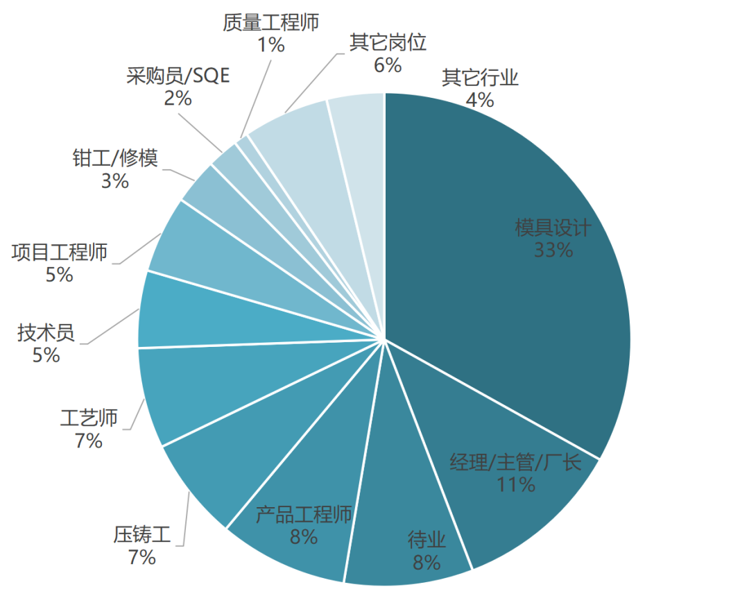 在千余名訓練營學員中,珠三角壓鑄人展現出了最大的學習興趣,適創研究院注意到,僅廣東一省的兄弟們就占據了超過四分之一的群體,且畢業率和優秀榮譽率十分突出;行業重心地區——浙江省的學員人數緊隨其后,位居第二;江蘇省壓鑄兄弟的學習意愿也頗為突出,位列第三。 在訓練營中,盡管千余名壓鑄兄弟身份各異,涵蓋了從現場技術到上級主管等十余種不同的崗位,但他們永不停止的求知心態,卻反映出了在新趨勢下,壓鑄行業“上下齊心,協同共進”繁榮奮斗的景象,其中,設計類崗位(模具設計、工藝設計等工程師)作為當今市場上最搶手的技術型人才,報名也最踴躍,是學員中占比最高的類別。