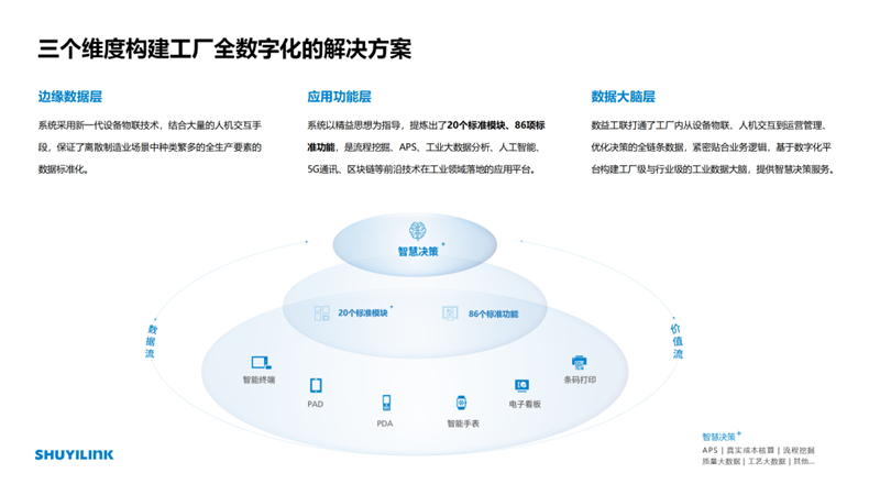 (3)制造企業(yè)對(duì)數(shù)字化的需求強(qiáng)烈,尤其是相對(duì)大型的企業(yè),本身要進(jìn)行大規(guī)模數(shù)字化改造,和整個(gè)自動(dòng)化結(jié)合,和產(chǎn)品的升級(jí)換代結(jié)合。高質(zhì)量的中小制造企業(yè)也亟待享受數(shù)字化所帶來的紅利,來加速整個(gè)生產(chǎn)效率的提高。這將是中國制造彎道超車的機(jī)會(huì)。 (4)新發(fā)展格局下,壓鑄行業(yè)迎來了結(jié)構(gòu)優(yōu)化的加速調(diào)整期,作為”高溫、高粉塵、高體力強(qiáng)度”的企業(yè),壓鑄企業(yè)的內(nèi)部管理能力、成本控制能力,外部市場(chǎng)抵御風(fēng)險(xiǎn)能力仍有提升空間。數(shù)字化能有效助力壓鑄企業(yè)打通全生產(chǎn)要素?cái)?shù)據(jù)流、提高設(shè)備開機(jī)率使用率,實(shí)現(xiàn)產(chǎn)品全追溯。 03.技術(shù)革新特點(diǎn) (1)數(shù)益工聯(lián)擁有極強(qiáng)的數(shù)據(jù)采集能力,能夠采用新一代設(shè)備物聯(lián)技術(shù),結(jié)合大量的人機(jī)交互手段,將離散制造業(yè)場(chǎng)景中的 “人、機(jī)、料、法、環(huán)、測(cè)、能源”等種類繁多的全生產(chǎn)要素?cái)?shù)據(jù)標(biāo)準(zhǔn)化。 (2)以精益思想為指導(dǎo),提煉出20個(gè)標(biāo)準(zhǔn)模塊、86項(xiàng)標(biāo)準(zhǔn)功能,應(yīng)用不同模塊內(nèi)容切實(shí)解決痛點(diǎn),實(shí)現(xiàn)企業(yè)橫向業(yè)務(wù)全流程打通,縱向數(shù)字化管理全人員打通。(3)擁有工業(yè)數(shù)據(jù)產(chǎn)品研發(fā)能力,緊密貼合業(yè)務(wù)邏輯,基于數(shù)字化平臺(tái)構(gòu)建工廠級(jí)與行業(yè)級(jí)的工業(yè)數(shù)據(jù)大腦,實(shí)現(xiàn)工廠APS自動(dòng)排產(chǎn)、工業(yè)大數(shù)據(jù)分析,設(shè)備的預(yù)測(cè)性維修、智能的異常感知等多種智能化的功能提供智慧決策服務(wù),將數(shù)據(jù)價(jià)值從系統(tǒng)里提升出來。 04.創(chuàng)新產(chǎn)品優(yōu)勢(shì) (1)“IE+IT”雙輪驅(qū)動(dòng)打造全5G壓鑄數(shù)字工廠 顛覆國際主流的改造設(shè)備、改造生產(chǎn)“大改大造”模式,不同于國內(nèi)純軟件定制路線,數(shù)益采用“IE(工業(yè)工程)+IT(信息技術(shù))”模式,將精益工程理念融入軟件系統(tǒng),實(shí)現(xiàn)了從現(xiàn)場(chǎng)到業(yè)務(wù)的縱向集成。核心團(tuán)隊(duì)為清華背景,有深厚的制造業(yè)精益運(yùn)營管理能力和豐富的壓鑄行業(yè)數(shù)字化工廠實(shí)施經(jīng)驗(yàn),旨在服務(wù)離散制造業(yè)客戶通過數(shù)字化顯著改善質(zhì)量管理水平、提升企業(yè)生產(chǎn)效率、降低制造成本。 (2)實(shí)現(xiàn)壓鑄工廠超90%數(shù)字化管理需求標(biāo)準(zhǔn)化 數(shù)益工聯(lián)按照工業(yè)工程和精益管理的底層理念,考慮了眾多細(xì)分行業(yè)和客戶場(chǎng)景,構(gòu)建了20個(gè)產(chǎn)品模塊、86個(gè)標(biāo)準(zhǔn)功能,69個(gè)核心亮點(diǎn)。針對(duì)大型制造企業(yè),實(shí)現(xiàn)了工廠85%數(shù)字化管理需求的標(biāo)準(zhǔn)化和可配置化,15% 的個(gè)性化服務(wù)。具體到壓鑄行業(yè),已達(dá)到高度的適配性,定制化服務(wù)比例僅需5%~10%,可為企業(yè)提供可靠完善的壓鑄數(shù)字化工廠解決方案。 (3)“131”快速交付與投資回報(bào) 1周規(guī)劃,數(shù)字化工廠項(xiàng)目顧問與設(shè)備物聯(lián)工程師通過現(xiàn)場(chǎng)調(diào)研工廠的設(shè)備、產(chǎn)品制造、運(yùn)營管理及倉儲(chǔ)物流等實(shí)際情況,制訂有效的數(shù)字化工廠規(guī)劃落地方案。 3個(gè)月上線,根據(jù)規(guī)劃的模塊與功能,設(shè)計(jì)標(biāo)準(zhǔn)化的項(xiàng)目實(shí)施路徑,構(gòu)建兩條主線(數(shù)字工廠實(shí)施藍(lán)圖、物聯(lián)采集)和三條支線(網(wǎng)絡(luò)、服務(wù)器、人機(jī)交互設(shè)備),最終實(shí)現(xiàn)設(shè)備的物聯(lián)采集和生產(chǎn)管理的全面數(shù)字化。 1年投資回收,基于數(shù)據(jù)應(yīng)用與價(jià)值分析,持續(xù)跟蹤運(yùn)營指標(biāo)的改善,提升生產(chǎn)效率、改善產(chǎn)品質(zhì)量、優(yōu)化庫存交期,通過提質(zhì)、增效、降本實(shí)現(xiàn)數(shù)字化工廠投入的快速回收。 05.創(chuàng)新技術(shù)專利情況 本產(chǎn)品屬于國家支持的一、電子信息(一)軟件11.云計(jì)算與移動(dòng)互聯(lián)網(wǎng)軟件高新技術(shù)領(lǐng)域。2021年12月,數(shù)益工聯(lián)制造執(zhí)行系統(tǒng)V1.0.0獲得浙江省首臺(tái)(套)產(chǎn)品,省內(nèi)首版次軟件認(rèn)定。軟件及相關(guān)技術(shù)均屬企業(yè)自主研發(fā),擁有技術(shù)全部所有權(quán),目前已授權(quán)計(jì)算機(jī)軟件著作權(quán)18項(xiàng),已授權(quán)外觀專利7項(xiàng),正在申請(qǐng)中發(fā)明專利5項(xiàng)。作為起草單位參與的1項(xiàng)國家標(biāo)準(zhǔn)處于審批階段,工業(yè)互聯(lián)網(wǎng)平臺(tái)-應(yīng)用實(shí)施指南(20211170-T-339)。